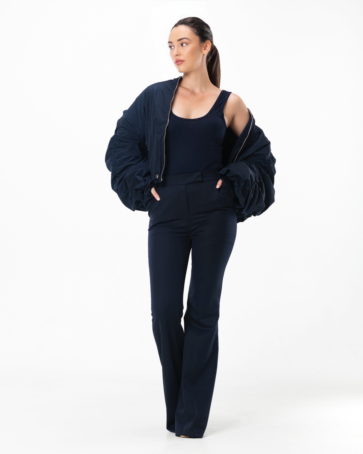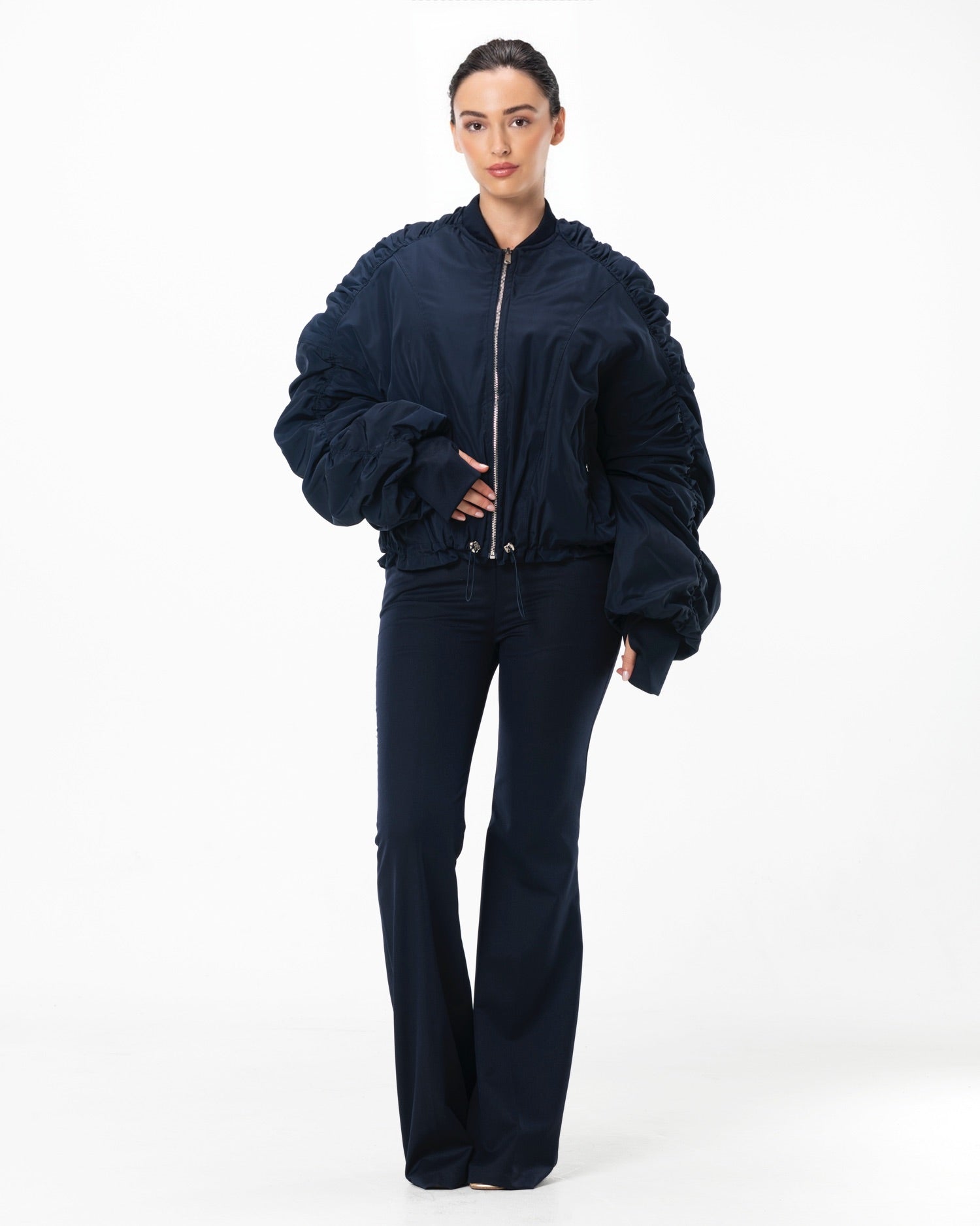 The Bomber Louvre is a dark navy statement jacket with voluminous ruched sleeves and a structured fit. Its modern silhouette adds an effortlessly cool edge to any look — perfect over the matching Louvre set or denim.