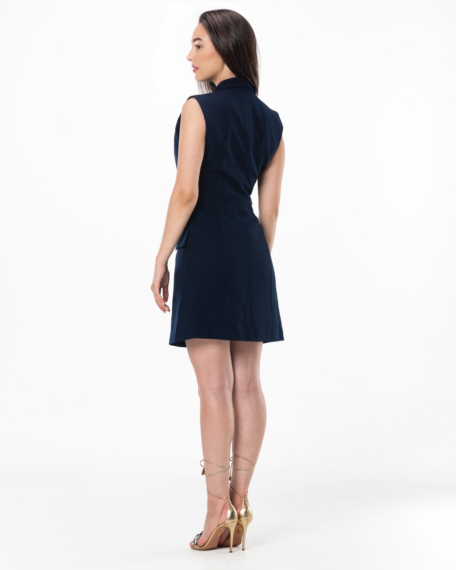 The Dress Notre is a sleeveless blazer dress with a structured fit and gold button details. Its tailored design combines sophistication with a modern edge. Available in black and navy for a timeless, elegant look. The model is wearing a size 36.