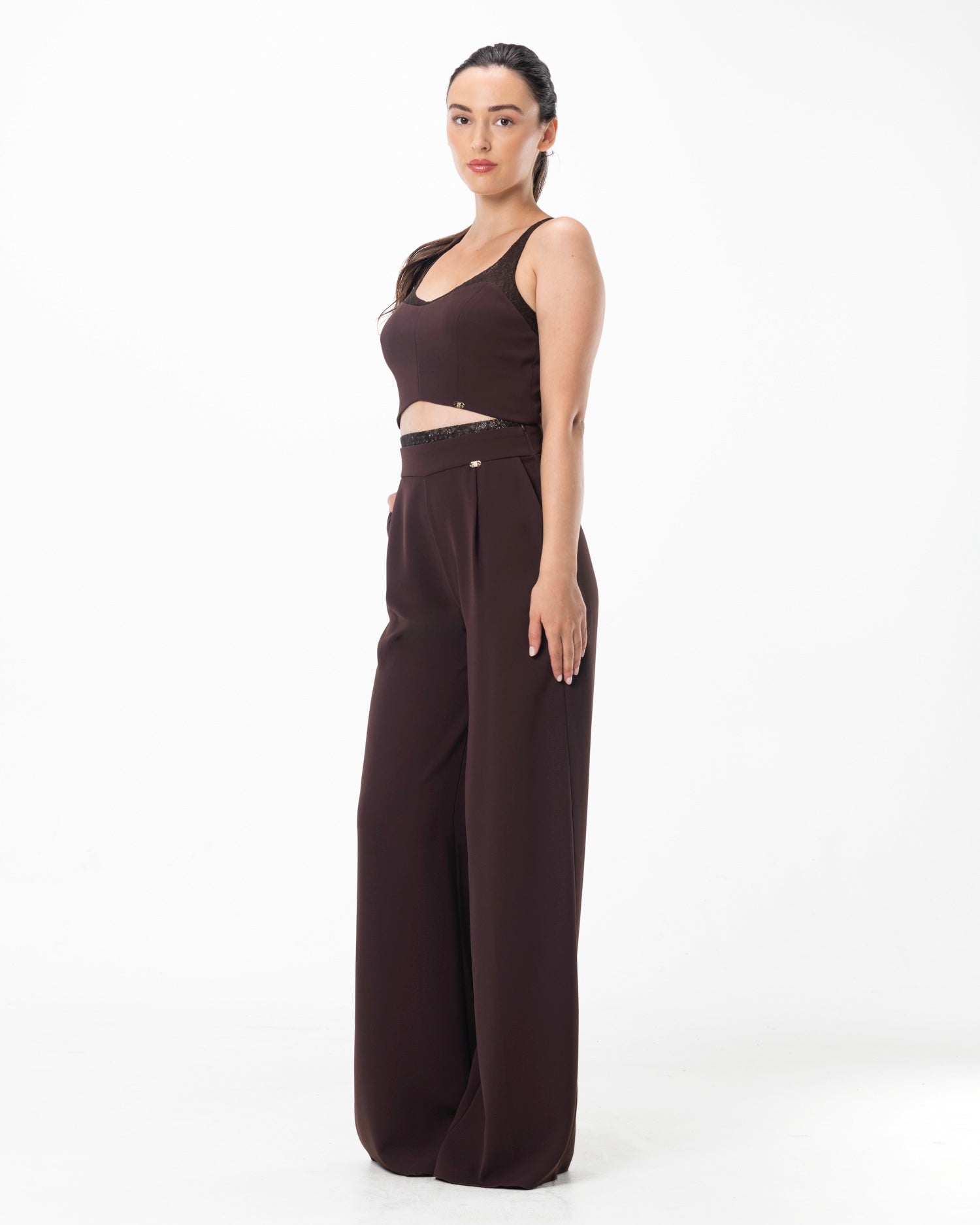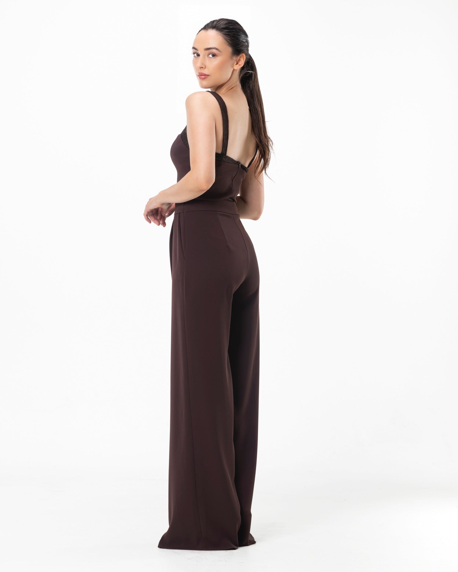The Arc Top in Brown features a sleeveless silhouette top, finished with delicate lace detailing along the top edge. The soft fabric and subtle lace touch create a refined, feminine look. Match with Trouser Arc.
