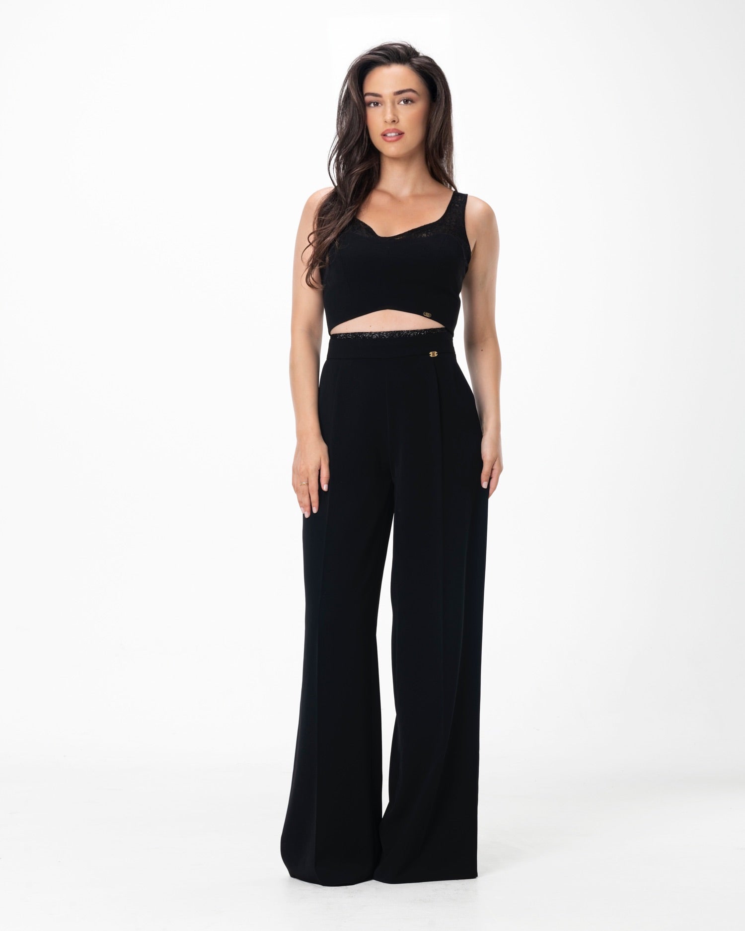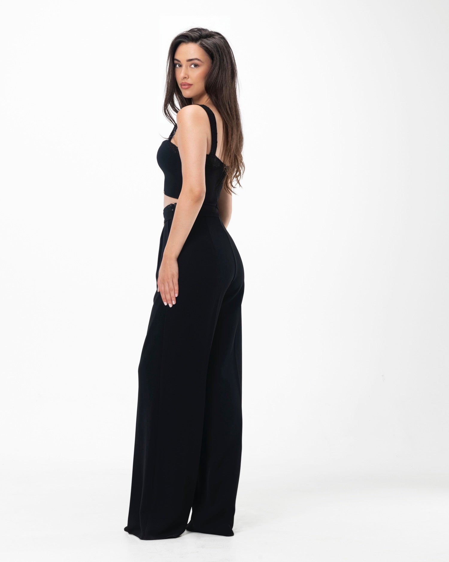 The Arc Top in Black features a sleeveless silhouette top, finished with delicate lace detailing along the top edge. The soft fabric and subtle lace touch create a refined, feminine look.The top has a zipper on the back. To finish your complete look match with Trouser Arc.