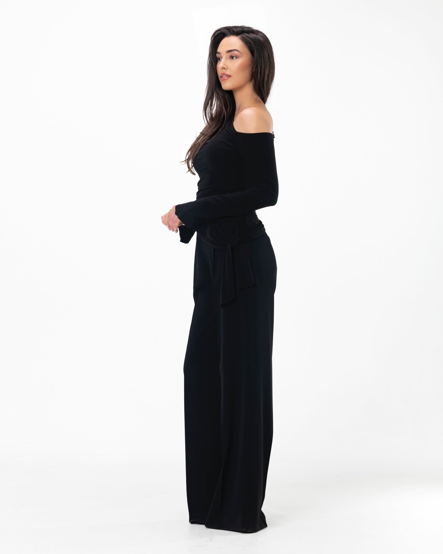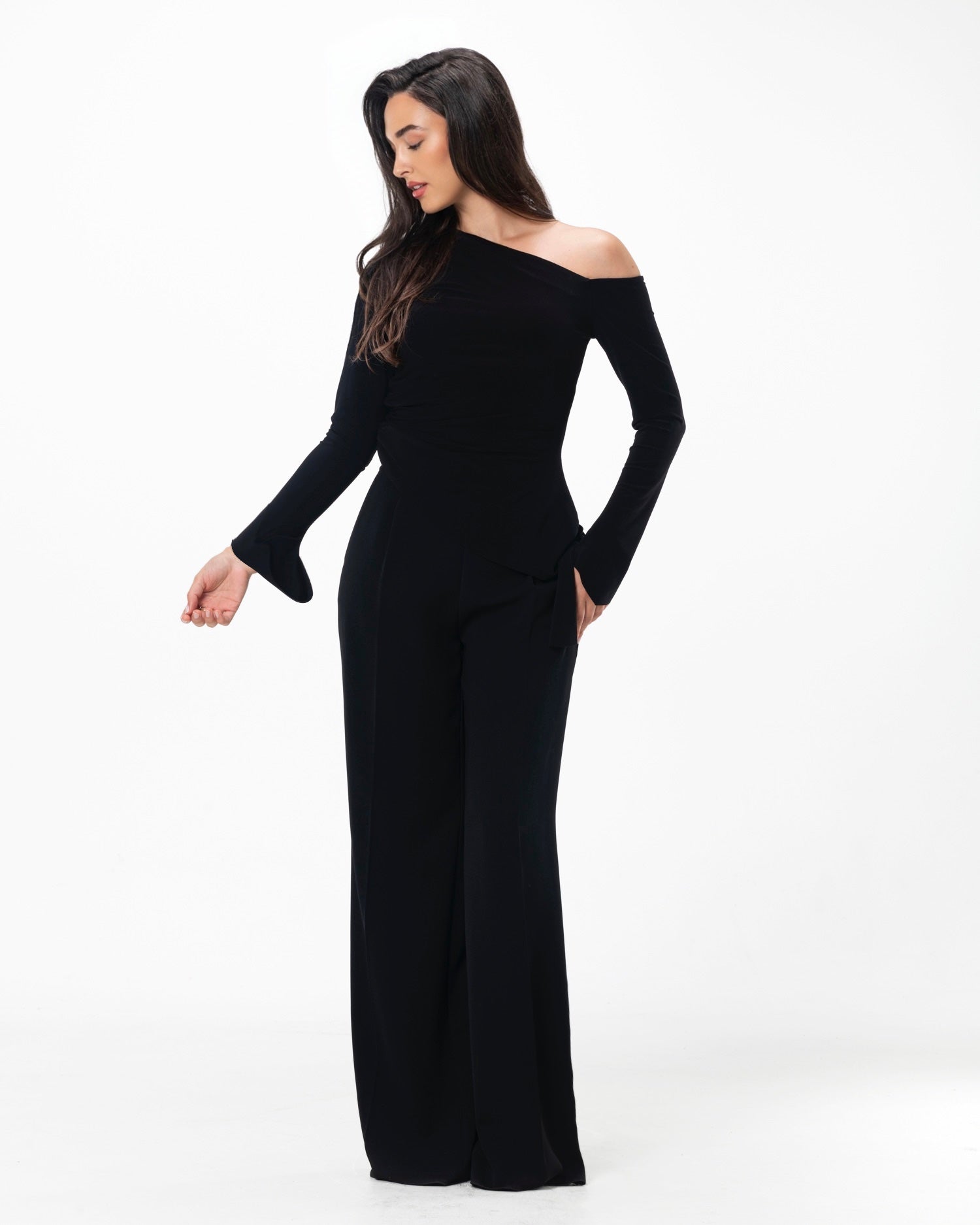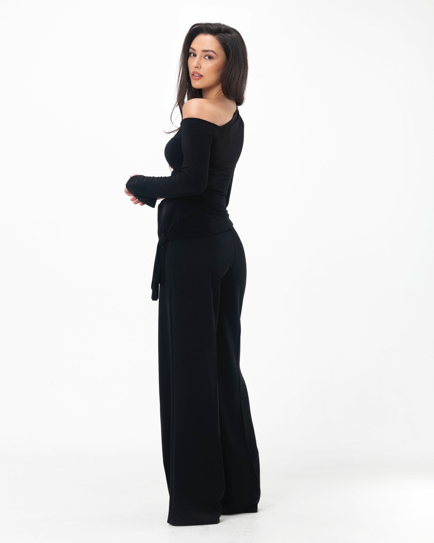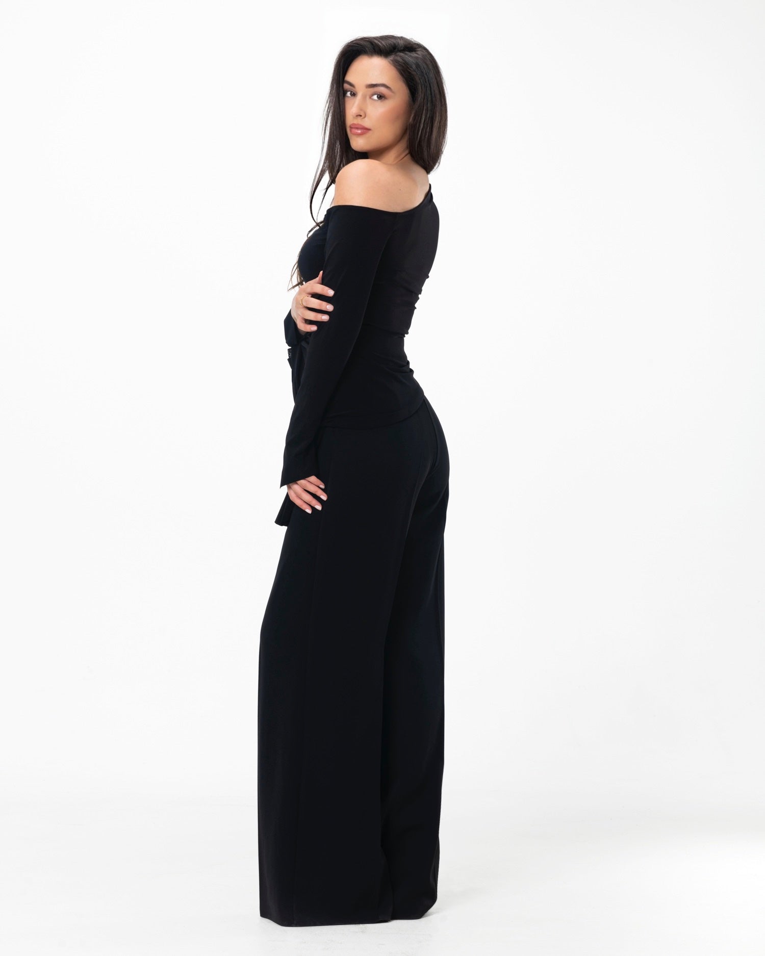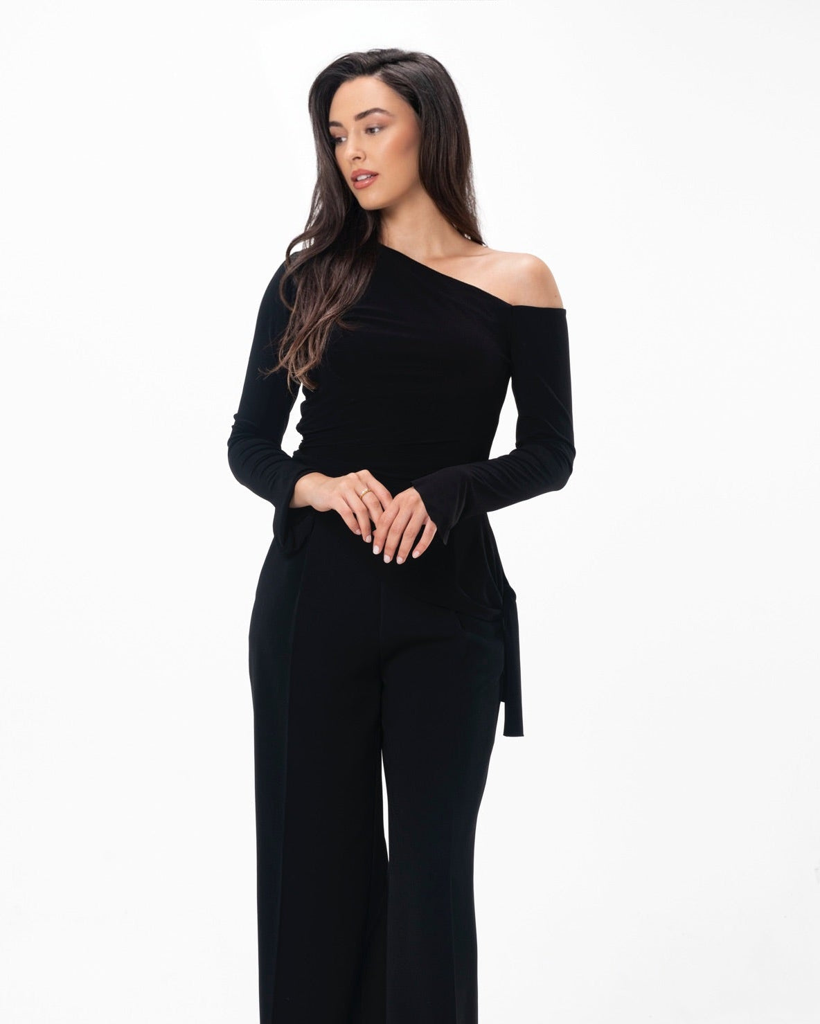 The Top Montagne in Black is a sleek, fitted piece with a smooth finish and an elegant asymmetric neckline that reveals one shoulder. The side is softly knotted, creating a flattering draped effect that highlights the waistline. This design detail adds a modern twist to a timeless silhouette — effortlessly chic for both day and evening looks.